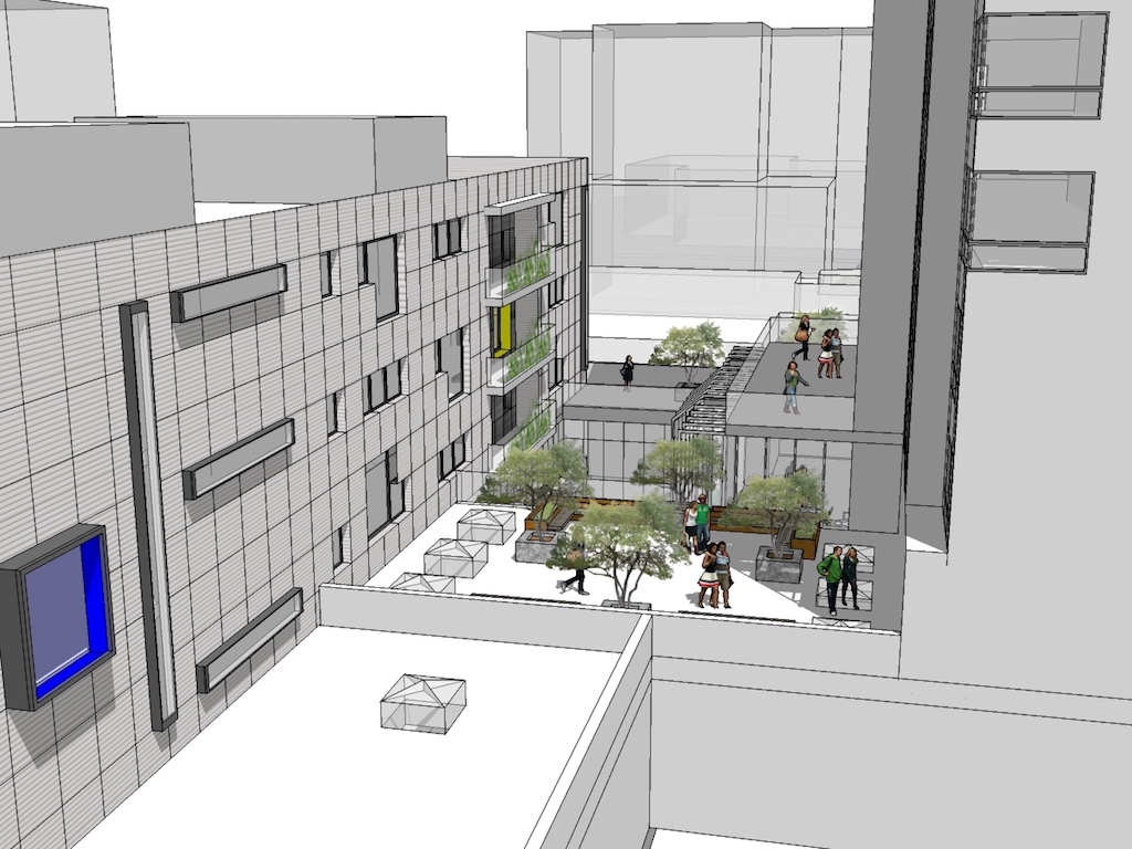The building is located in Brooklyn and consists of a 13-story hotel and a 4-story health care facility. The hotel lobby is designed to have a two-floor high ceiling great hall to create a magnificent open space on the hotel first floor. The roof terrace on the hotel tower provides a rooftop bar for the restaurant on the top floor. On the other side, the office building has four stories and each two levels has a high ceiling elevator lobby. The balconies and big windows facing courtyard create interesting color patterns on the office facade, as well as provide great views of the city scape.
