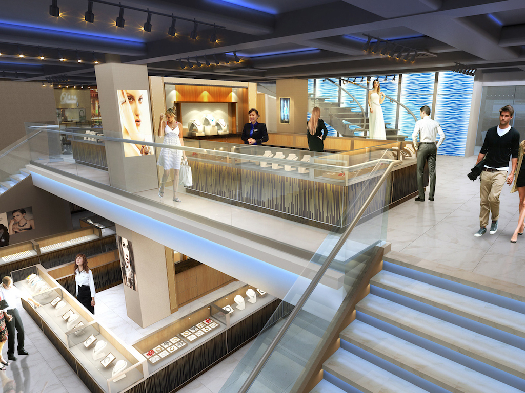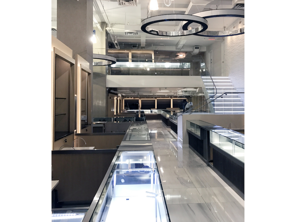 Complete overhaul of existing jewelry and diamond exchange retail space in the primary area of the Diamond Exchange near Times Square, including vestibule, office lobby, 1st and mezzanine commercial retail space. The renovation created high ceilings with stylish diamond ring lightings. Upscale showcases were customized to suit the space in an organized fashion.